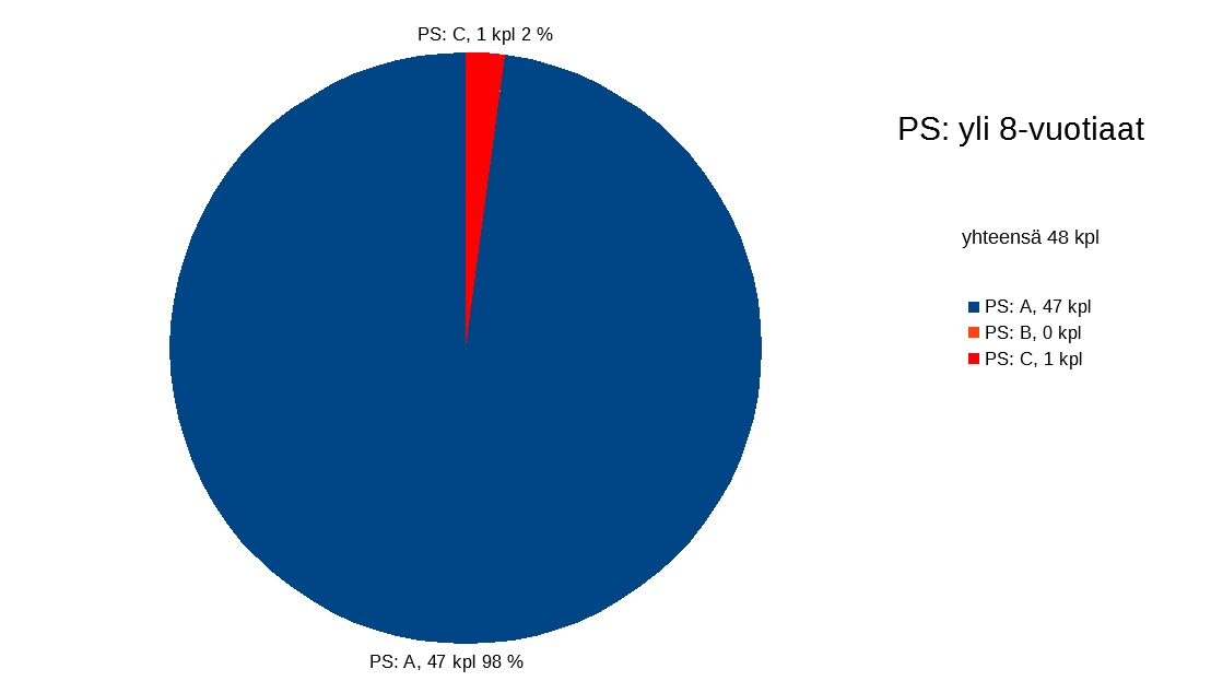 Koska tutkimuksia on edelleen melko vähän, kun aletaan tarkastella koiria iän mukaan vuosittain, niin olen jakanut tarkasteltavat ryhmät kaikkien tutkimusten lisäksi kuuteen eri ikäluokkaan: alle 3-vuotiaat, 3-6-vuotiaat, alle 5-vuotiaat, 5-8-vuotiaat, yli 6-vuotiaat ja yli 8-vuotiaat. Ikäluokissa on otettu huomioon vain koiran tuorein ultratulos ja se voi olla edustettuna useassa eri ryhmässä, eli jos koira on käynyt ultrassa 2- ja 4-vuotiaana, sen tulos löytyy ryhmistä alle 3-vuotiaat, 3-6-vuotiaat ja alle 5-vuotiaat ja alle 5-vuotiaiden ryhmässä huomioidaan vain 4-vuotiaana tehty tutkimus.
